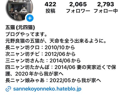 元野良猫を保護し、猫の多頭飼いしております。2010年、はやとちりから、保護猫との生活を始めた男の日々。あれよあれよ、と、二猫、三猫となり、2020年6月に、四猫となりました。猫との生活、猫の行動、猫の食べ物や病気、等等、保護猫との生活にて感動した事などを綴ってきます。野良猫として生を授かり、保護猫として命を全うしていく、四猫。2022年、都内に戸建て物件を購入し引っ越しをしました。2022年5月31日、五猫となりました。